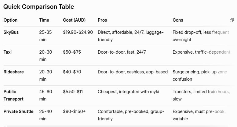 For the latest schedules or fares, check the SkyBus website, PTV journey planner, or rideshare apps. If you have specific needs (e.g., accessibility, group size, or hotel location), let me know for tailored advice!